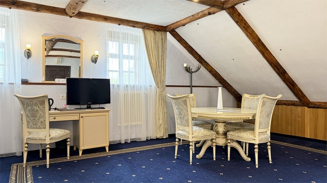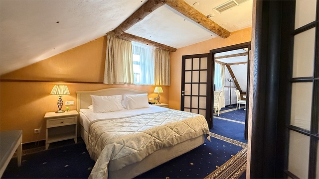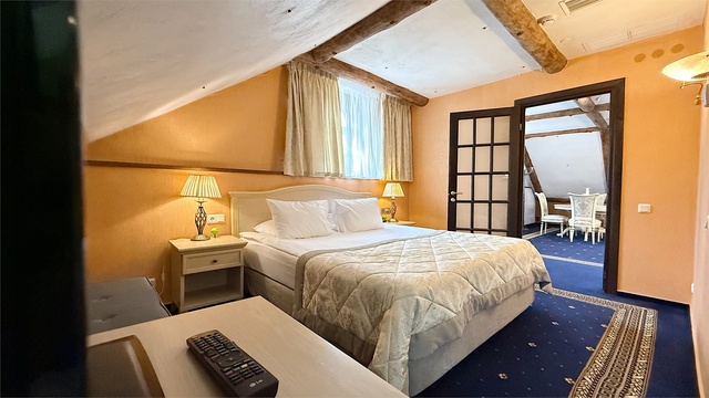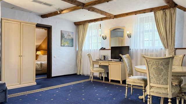Превосходный двухкомнатный люкс, площадью 52 кв.м., с гостиной и спальней. При планировании и дизайне применялся подход, характерный для XIX столетия – пространства комнат не спорят с городом, а демонстрируют все лучшее, что может даровать цивилизация в созвучии с искусством. Они придутся по вкусу людям с философским складом ума, творческим натурам, романтикам или филантропам. Большие окна позволяют встречать красочные Псковские рассветы и наслаждаться поэзией сдержанных северных закатов над панорамой города. Ненавязчивый и привычный комфорт подкреплен высокотехнологичным оснащением, идеально вписанным в дизайн номеров: • рабочий стол • круглый стол на 6 персон • журнальный столик c 2 креслами • диван-кровать • королевская кровать • электронные замки, работающие в режиме on-line • автоматическая система пожаротушения • индивидуальная система кондиционирования • плазменная панель, кабельное ТВ • бесплатный Wi-Fi интернет • мини-бар • бутилированная вода • чайная станция • сейф • телефон ванные комнаты, как и номера, оснащены только самым лучшим: • ванна-джакузи • душевая кабина • биде • халаты, тапочки и полотенца из деликатного текстиля • аксессуары • косметическая линия для ванны и душа • гигиенические принадлежности • фен • телефон В стоимость включено посещение бассейна в СПА - центре с 07.00 до 21:00 (по предварительной записи по тел.: 8 (8112) 79-45-00 или 89116979685).